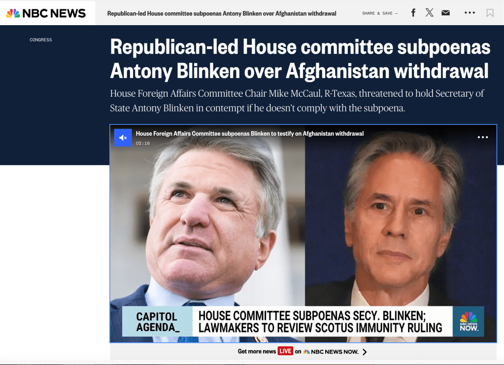 A breaker on a high-profile subpoena (NBC News). “Republican-led House committee subpoenas Antony Blinken over Afghanistan withdrawal” Sept. 3, 2024.